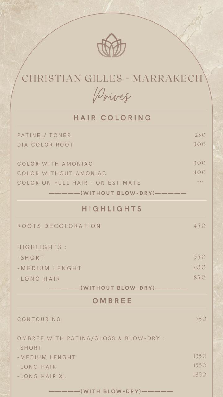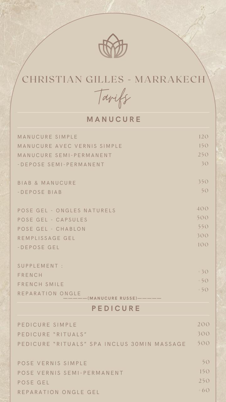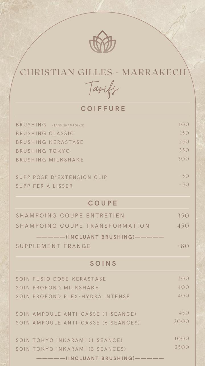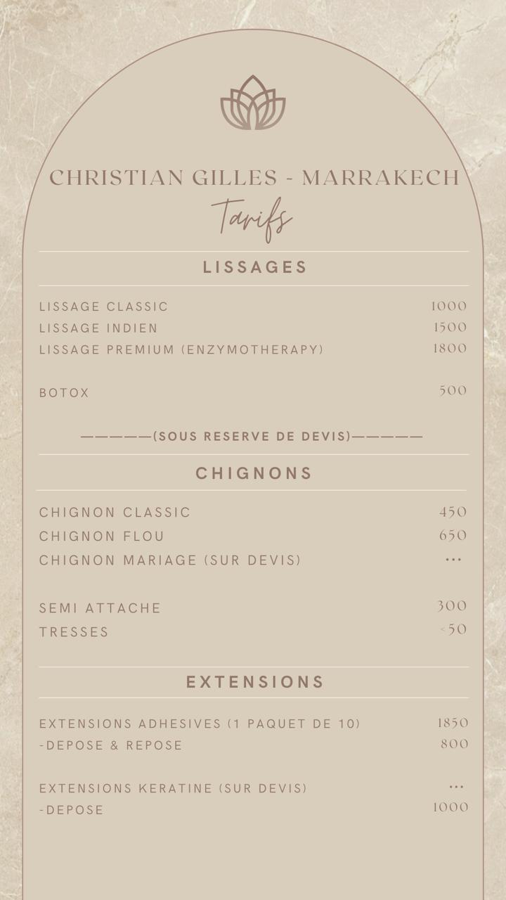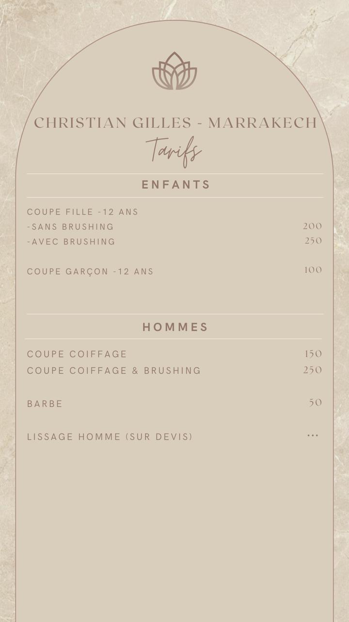 Situé au coeur de Marrakech, le salon de beauté Christian Gilles vous accueille dans un cadre élégant et raffiné, où chque détail est pensé pour votre bien-être.