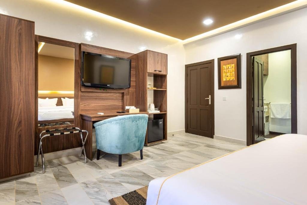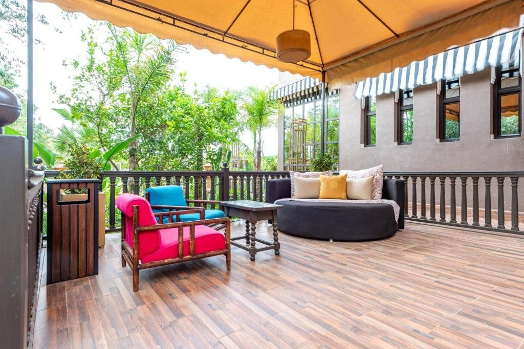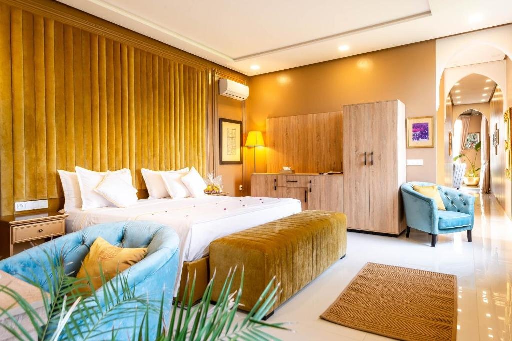 Suite équipée d’un très grand lit. Elle dispose d’un balcon et propose une vue sur le jardin.